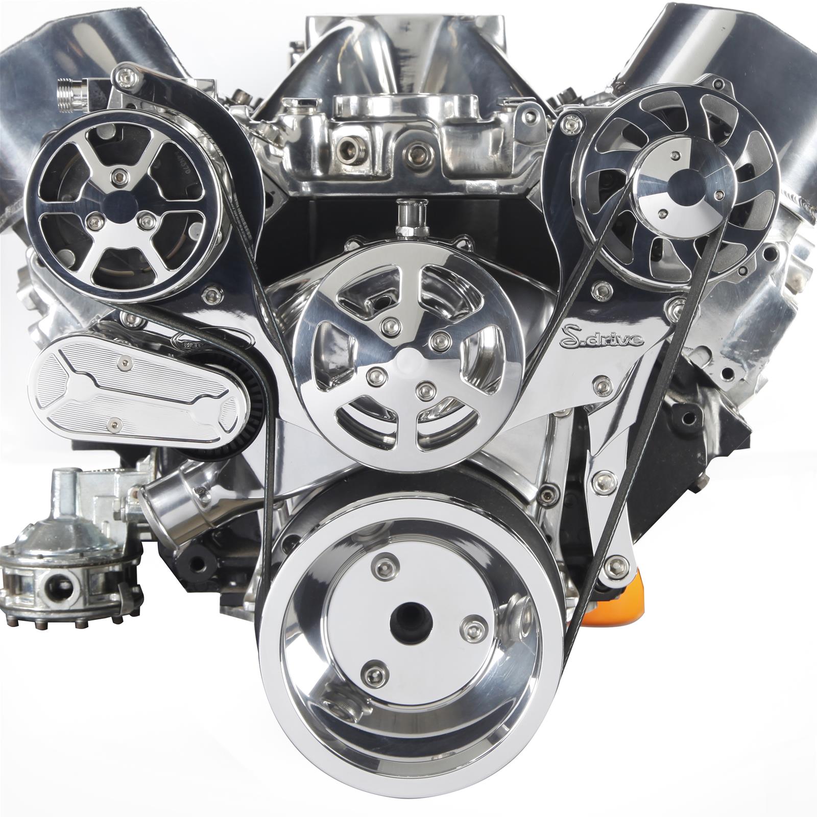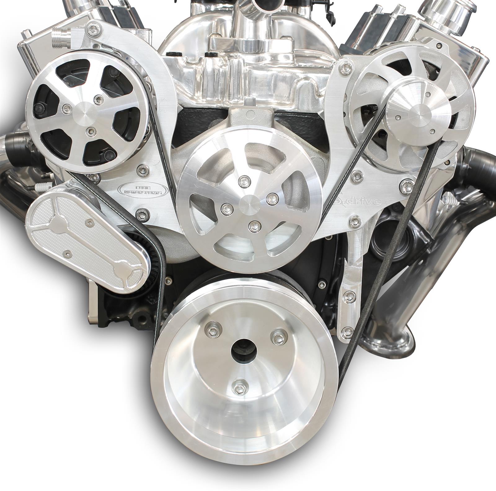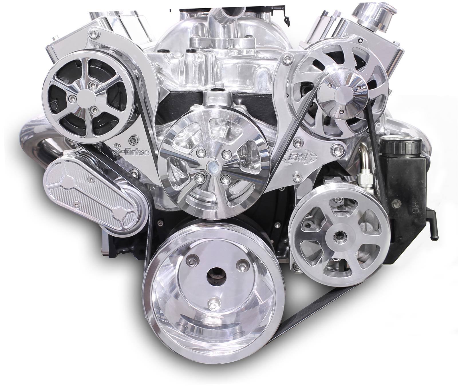 Eddie Motorsports' S-Drive Plus 8 rib serpentine pulley kits include everything to accessorize your Small Block Chevy engine. High performance 8 rib kits handle 33% more torque and horsepower then standard 6 rib systems. Kits come complete with all of the necessary precision CNC machined billet aluminum brackets & pulleys, which are made in the USA, as well as high quality, name brand components; Tuff Stuff / PRW aluminum water pump, Sanden-style compact AC compressor, GM type II power steering pump with attached plastic reservoir, Powermaster 170 amp alternator. Available in 13 custom finishes.