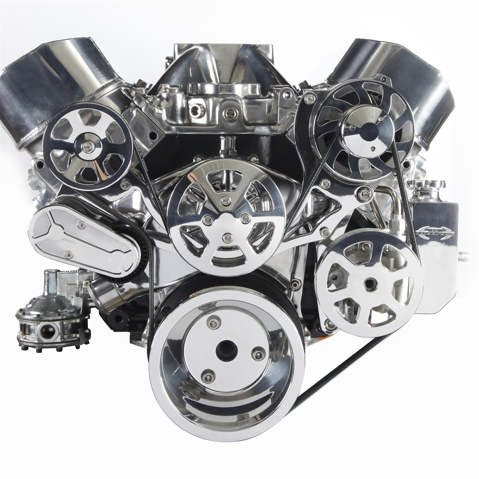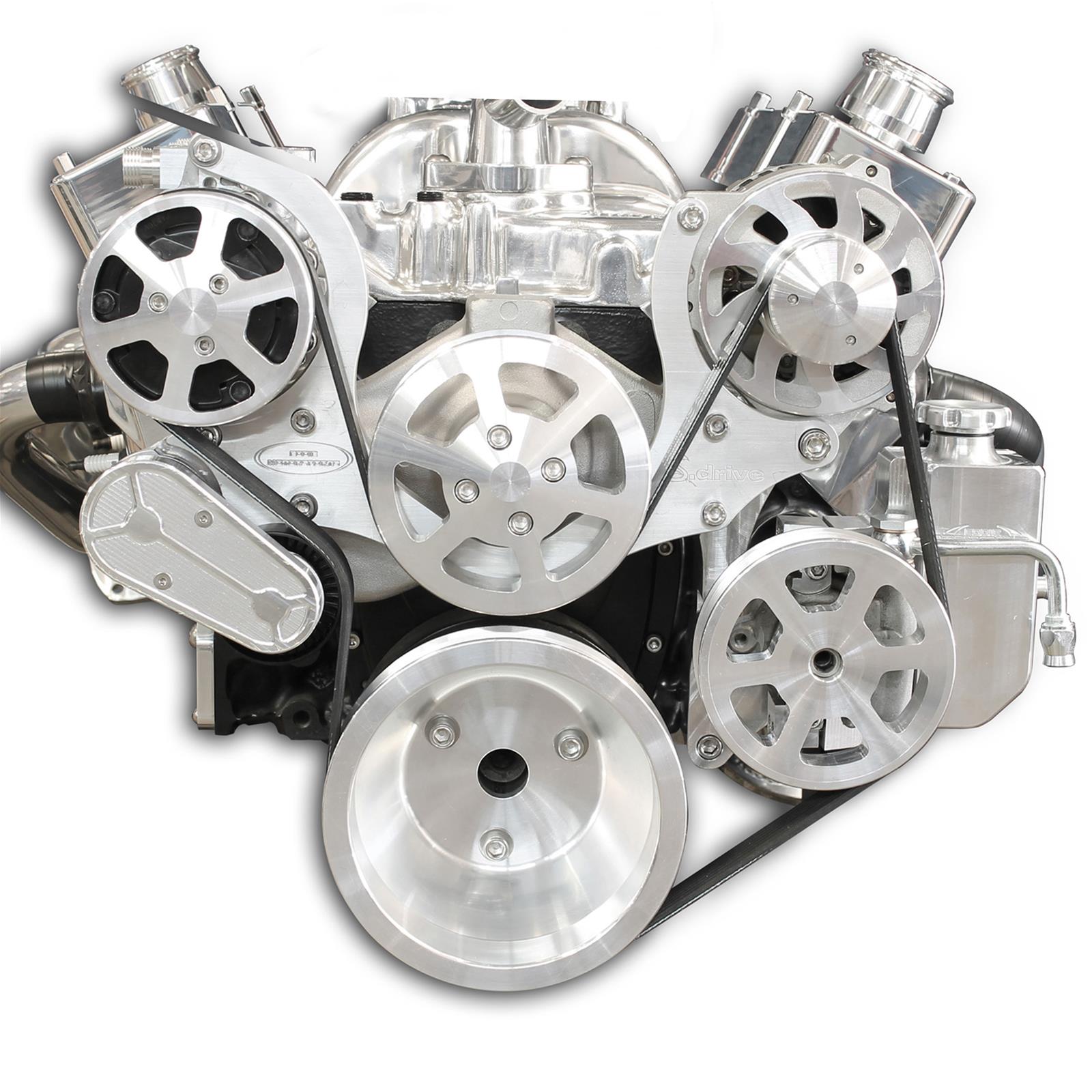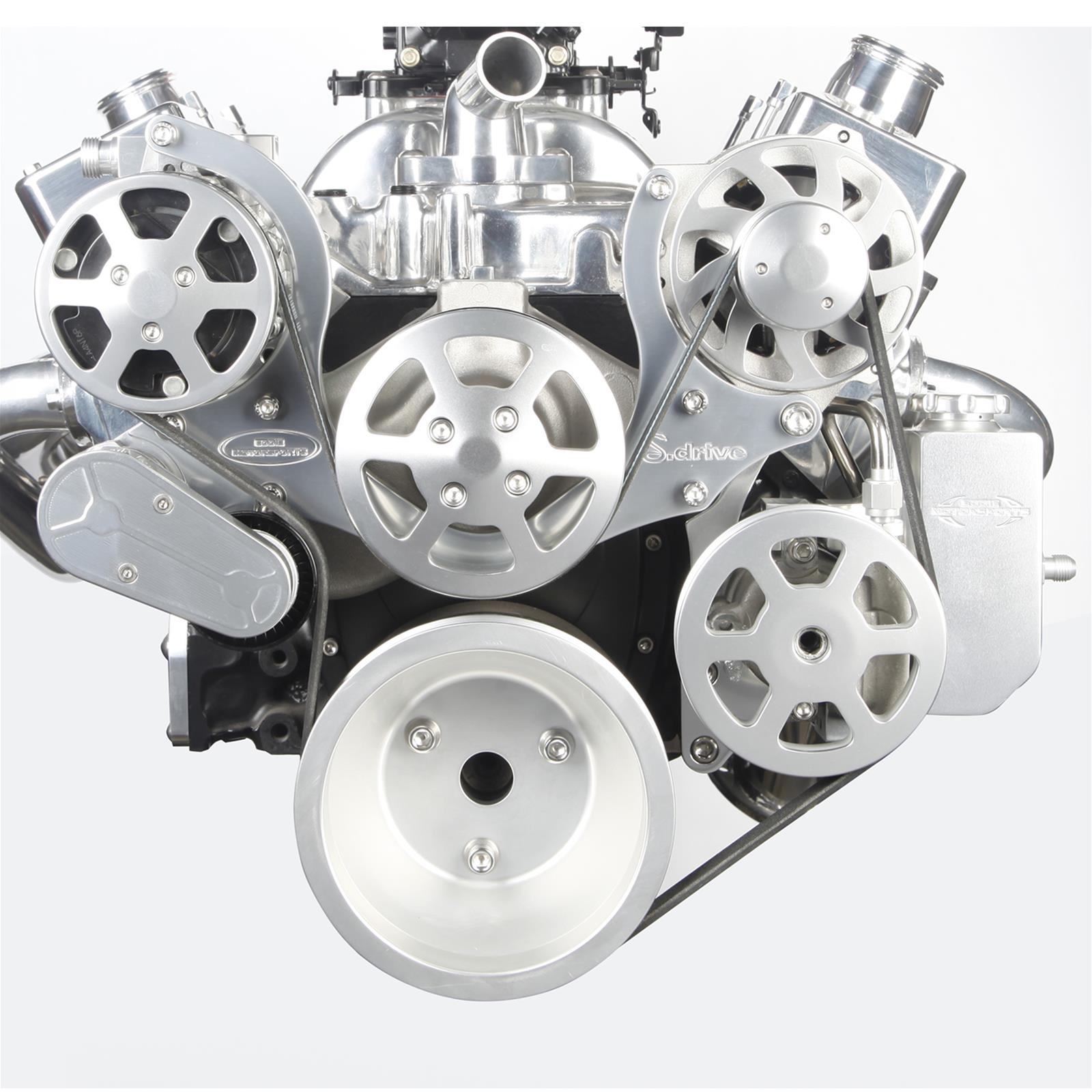 Eddie Motorsports' S-Drive Plus 8 rib serpentine pulley kits include everything to accessorize your Small Block Chevy engine. High performance 8 rib kits handle 33% more torque and horsepower then standard 6 rib systems. Kits come complete with all of the necessary precision CNC machined billet aluminum brackets & pulleys, which are made in the USA, as well as high quality, name brand components; Tuff Stuff / PRW aluminum water pump, Sanden-style compact AC compressor, GM type II power steering pump with attached plastic reservoir, Powermaster 170 amp alternator. Available in 13 custom finishes.